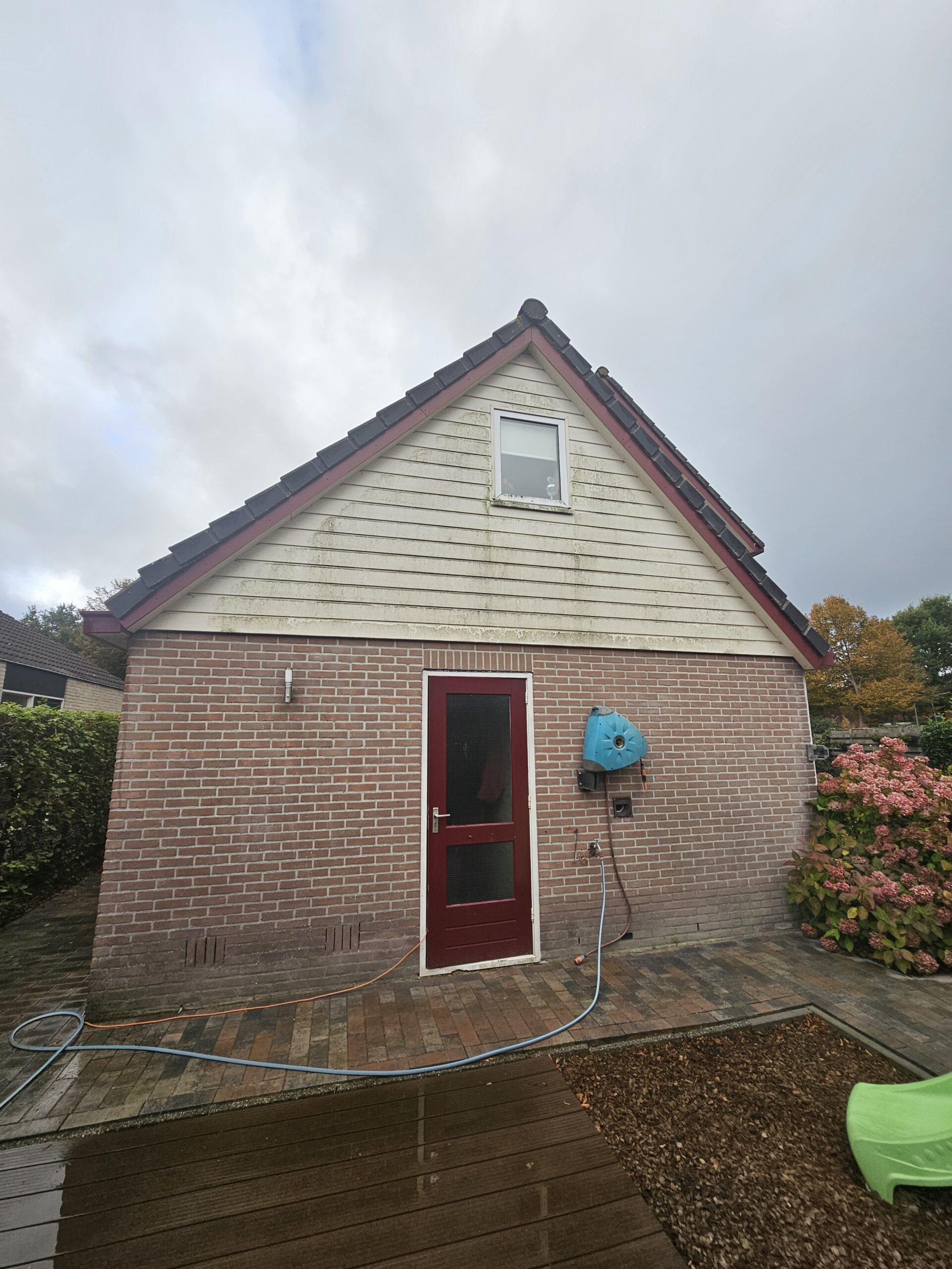 Bij deze reiniging is de gevelplaat eerst zorgvuldig ingespoten met een softwash-oplossing, die enige tijd heeft kunnen inwerken. Vervolgens zijn alle delen grondig geborsteld om aanslag en vervuiling te verwijderen. Na het afspoelen zijn de resterende plekken handmatig met de borstel gereinigd en opnieuw afgespoeld met osmosewater voor een streeploos resultaat. Tot slot zijn ook het raam en de deur gewassen met de Tucker-pole, waardoor het geheel weer een frisse en verzorgde uitstraling kreeg.