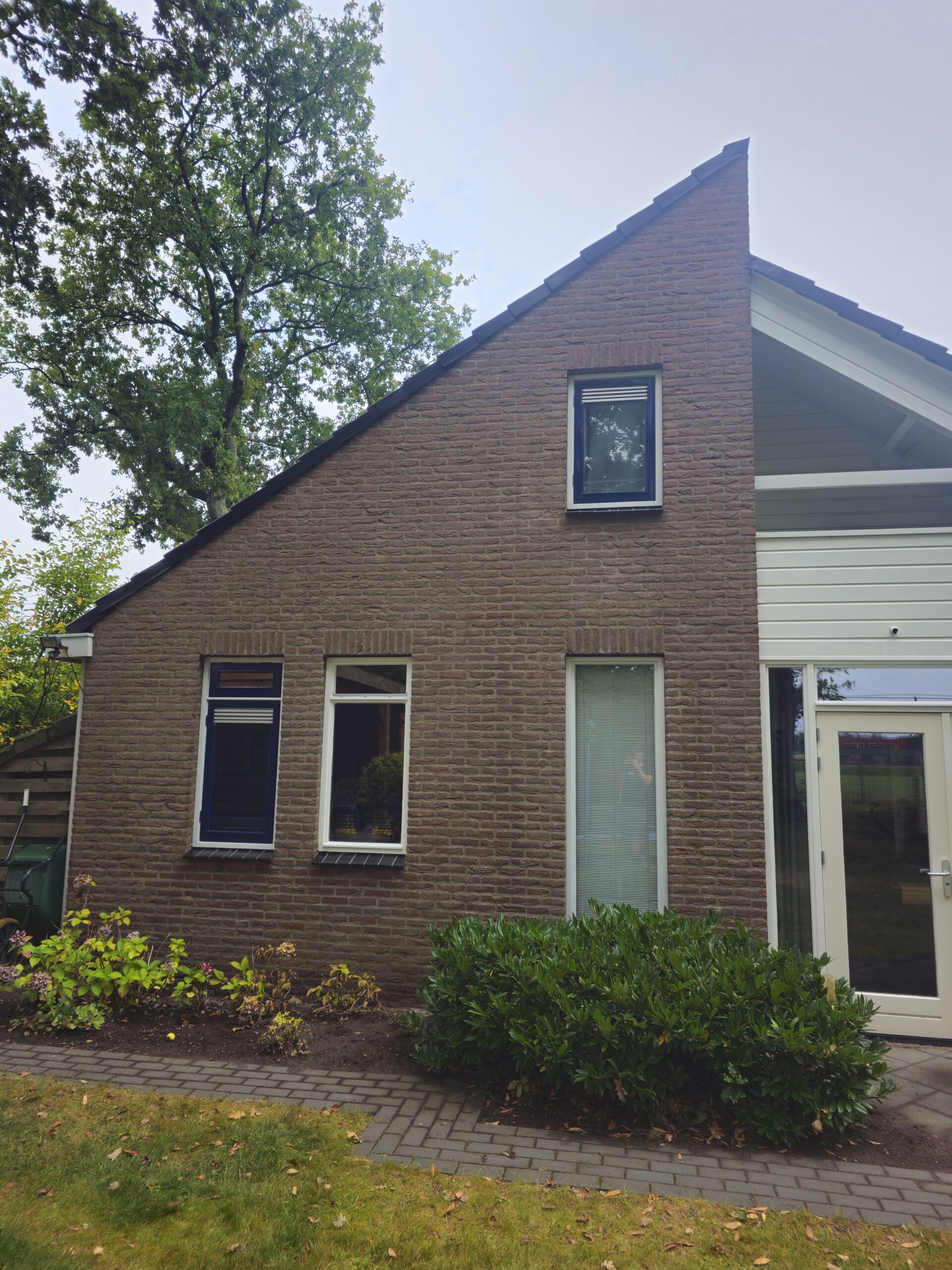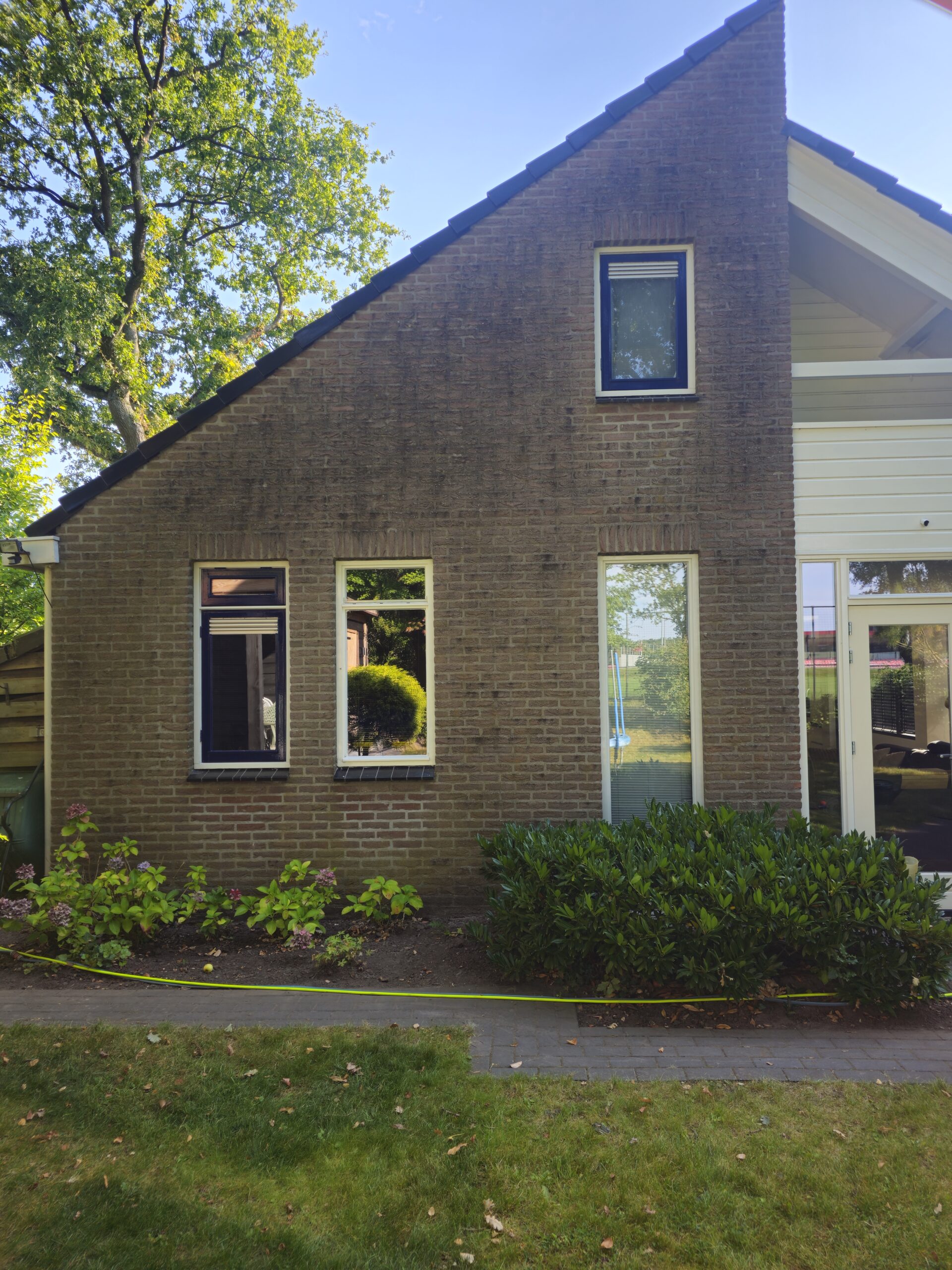 Bij deze gevelreiniging is de gevel zorgvuldig behandeld met de softwash-methode. Eerst is het oppervlak met een zachte borstel met lage druk gereinigd, zodat al het vuil en de aanslag op een veilige manier verwijderd konden worden. Het reinigingsmiddel heeft vervolgens even kunnen inwerken voor een optimaal resultaat. Daarna is de gevel grondig afgespoeld en volledig laten drogen. Om de gevel te beschermen tegen nieuwe vervuiling en vochtindringing, is deze na het drogen geïmpregneerd met een ademende, waterafstotende coating. Tot slot zijn ook de kozijnen en ramen gereinigd, waardoor het gehele pand weer een verzorgde en frisse uitstraling kreeg.